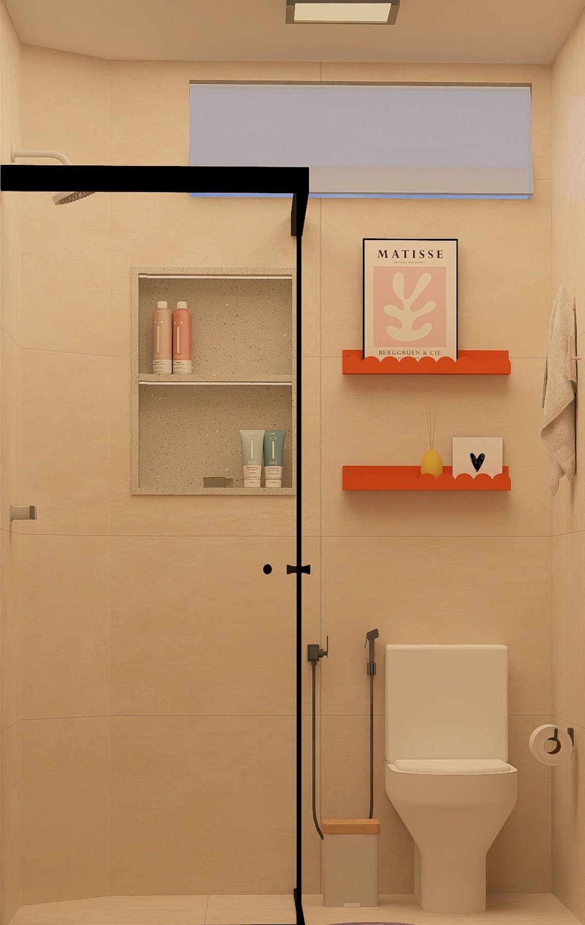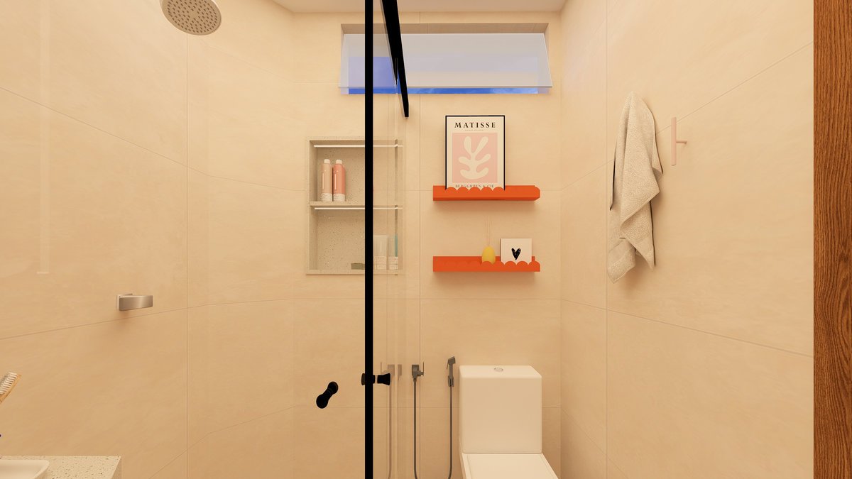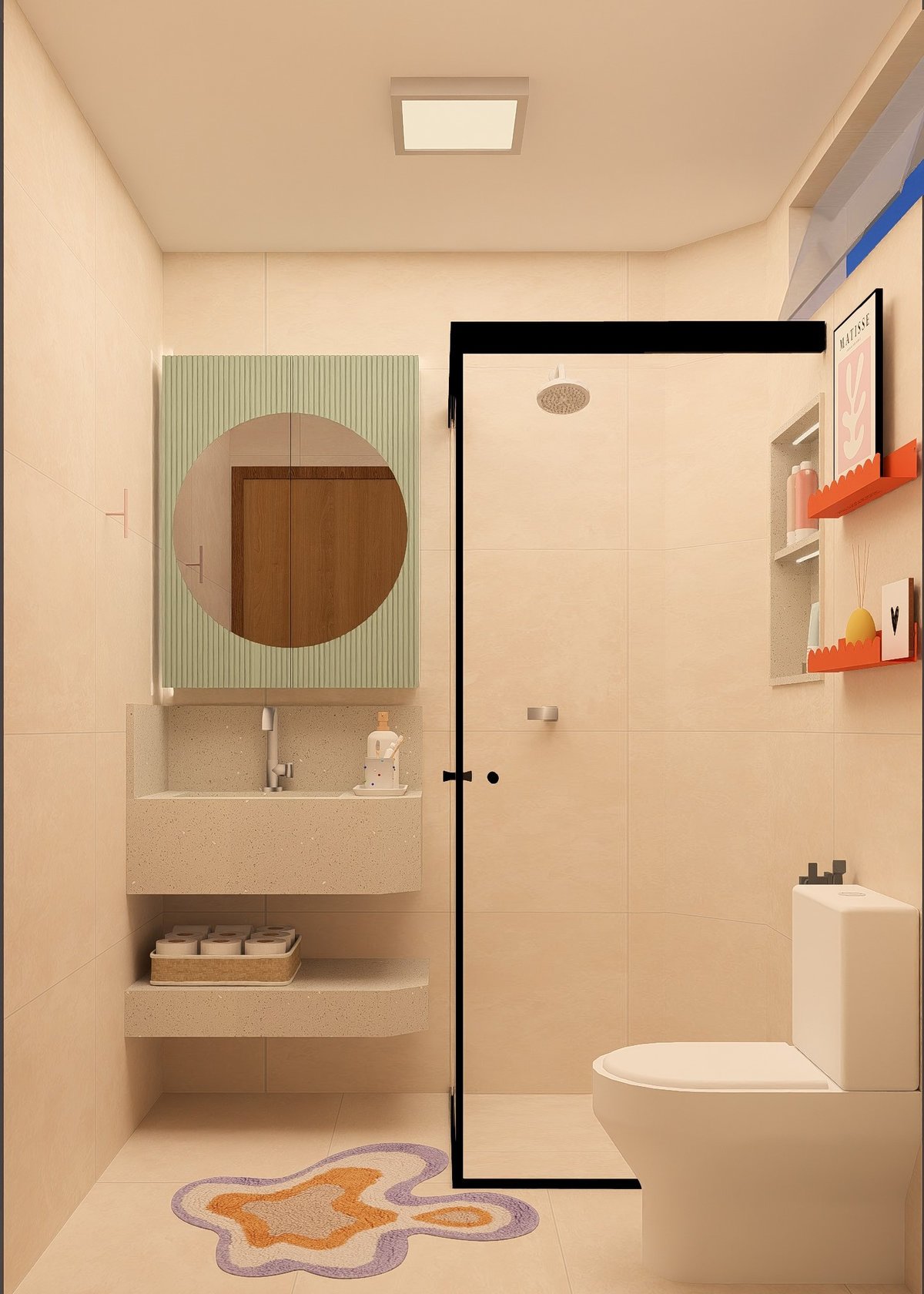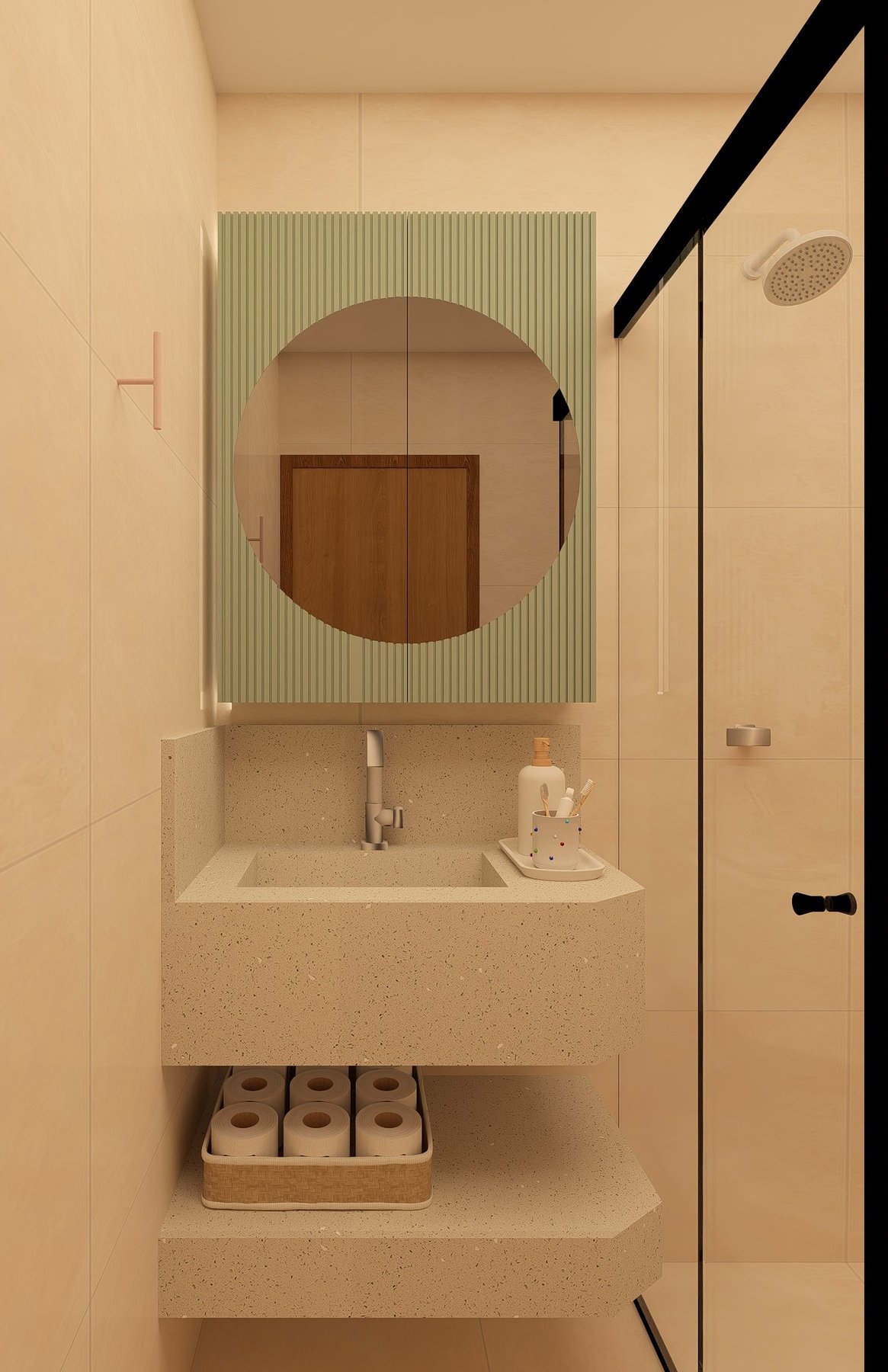 Um banheiro que estava aparentemente “pronto” ganhou contornos de cor e personalidade da nossa cliente com mobília e decoração desenvolvidas por nós! O espelho em verde menta com o espelho redondo da personalidade à base off white que já estava instalada no banheiro através do revestimento e pedra anteriormente escolhidos pela cliente. As prateleiras laranja dão possibilidade de acrescentar elementos que enriquecem ainda mais o banheiro.