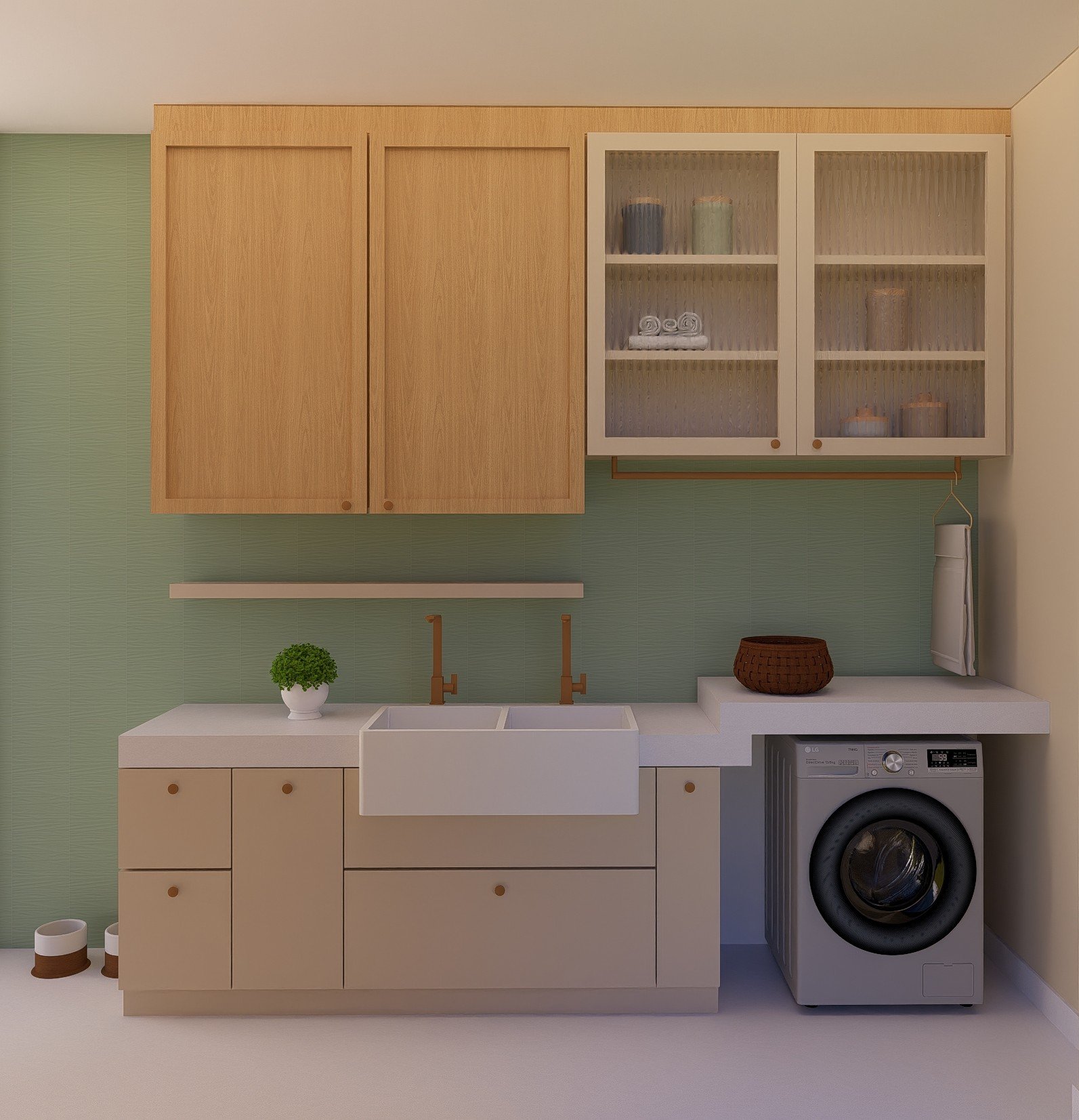 Por aqui usamos o revestimento AMB Pampas da Decortiles que fez total diferença, combinado com a marcenaria da Guararapes em dois tons. Para finalizar, o detalhe dos vidros canelados, que dão um charme a mais para o armário suspenso.