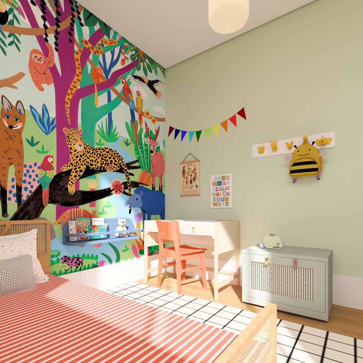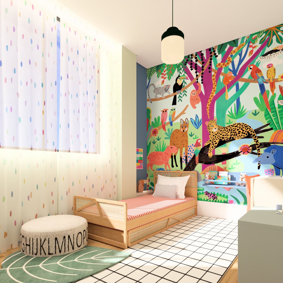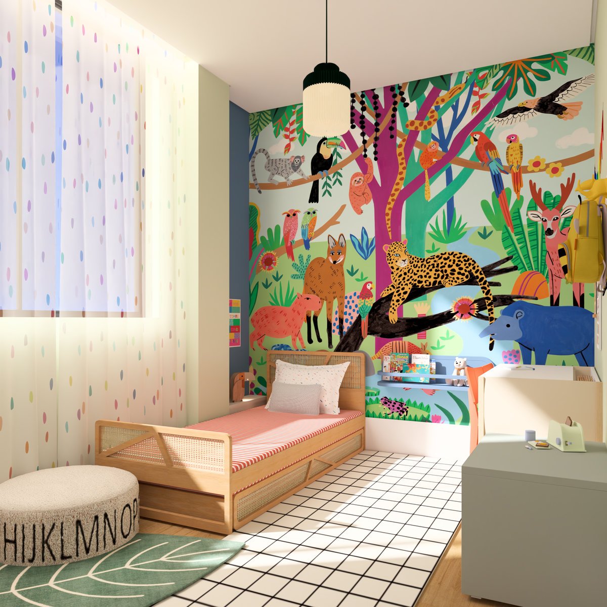 Quarto infantil em apartamento alugado, com móveis que podem ser reaproveitados em outro momento. Os papais nos solicitaram um ambiente divertido que instigasse a curiosidade e apoiassem os momentos de brincadeira do filho. O tema surgiu a partir de um pedido do nosso mini cliente que solicitou que tivessem “muitos animais” – tema que ele gosta muito. Por isso, escolhemos primeiro o painel de parede da marca Mooui e, através dele, selecionamos alguns mobiliários soltos, coloridos e funcionais que pudessem proporcionar muito conforto e momentos de brincadeira para o pequeno.