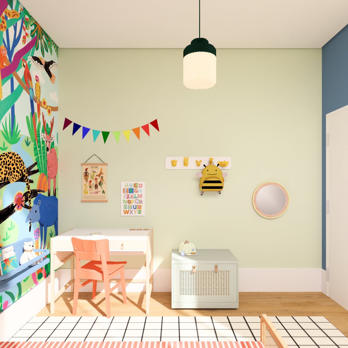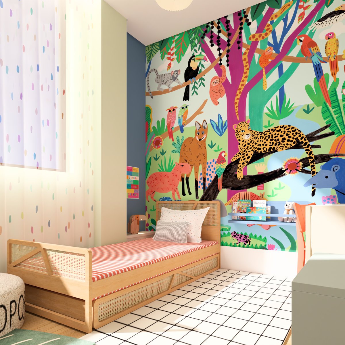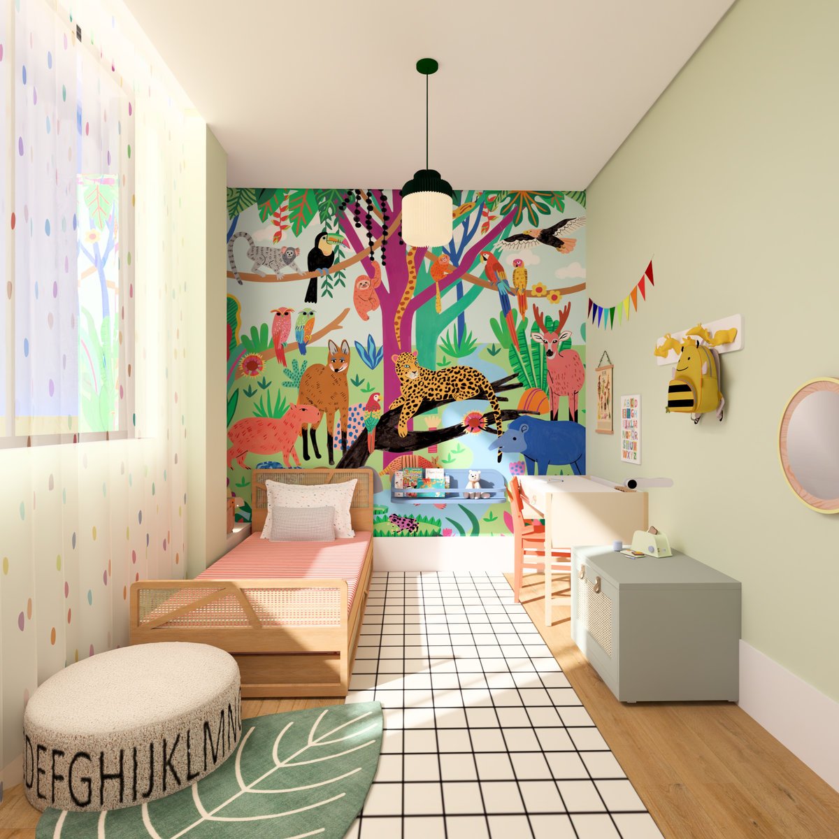Quarto infantil em apartamento alugado, com móveis que podem ser reaproveitados em outro momento. Os papais nos solicitaram um ambiente divertido que instigasse a curiosidade e apoiassem os momentos de brincadeira do filho. O tema surgiu a partir de um pedido do nosso mini cliente que solicitou que tivessem “muitos animais” – tema que ele gosta muito. Por isso, escolhemos primeiro o painel de parede da marca Mooui e, através dele, selecionamos alguns mobiliários soltos, coloridos e funcionais que pudessem proporcionar muito conforto e momentos de brincadeira para o pequeno.